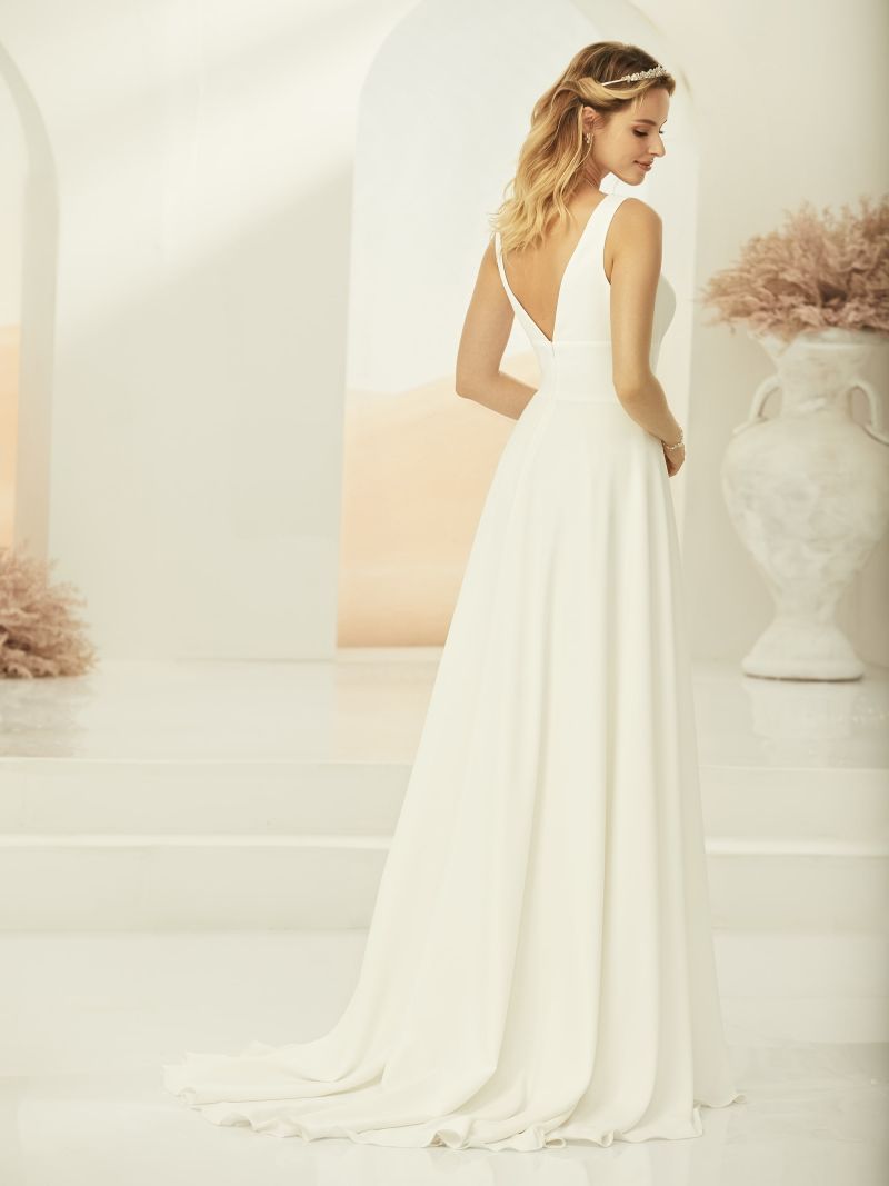 Anastasia is a modern A-line wedding dress made of high-quality georgette. Anastasia has a beautiful deep V-neckline with soft tulle inserts for discrete coverage. The deep V back and straight skirt is paired with a train making it the epitomy of elegance.