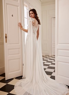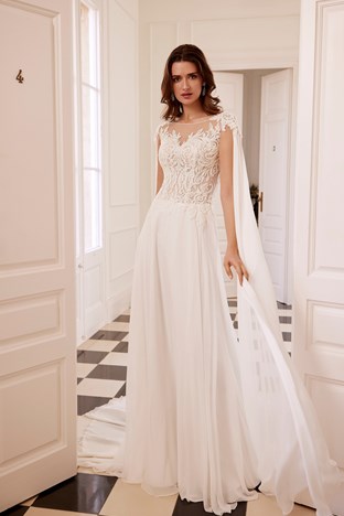 A dramatic yet elegant chiffon wedding dress with detachable full length cape sleeves and lace accents. Featuring a bateau neck and illusion back detail that creates a romantic bridal style