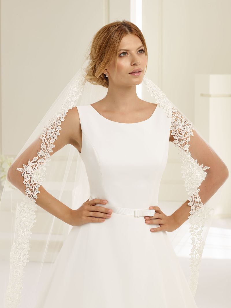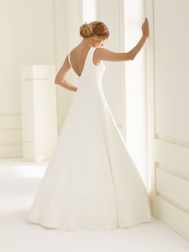 Imperia is a simple yet elegant wedding dress, made from chiffon with a high front bateau neckline and deep v-back. The dress has a non-slip elastic strap to hold in place, a fine belt, a 1.6 inch seam allowance and a zipper at the back