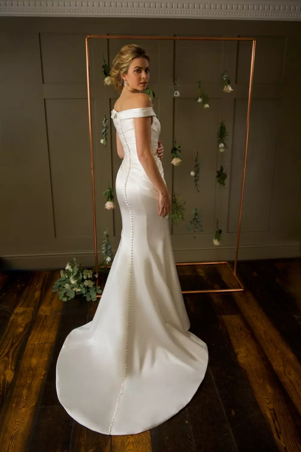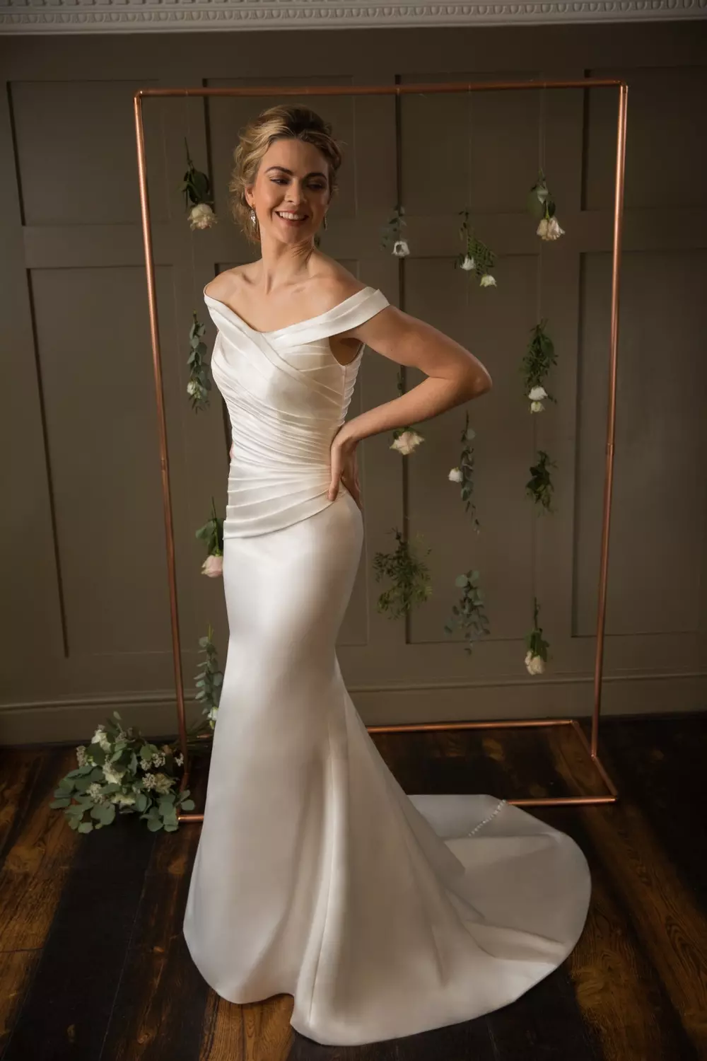 This classic off the shoulder fishtail silhouette gown has a beautiful touch of elegance with its satin wrap over collar and draped pleated across the body down which accentuates the waist for a flattering shape that continues over the hips. Finished with covered buttons over zipper closure and all the way to the hem.