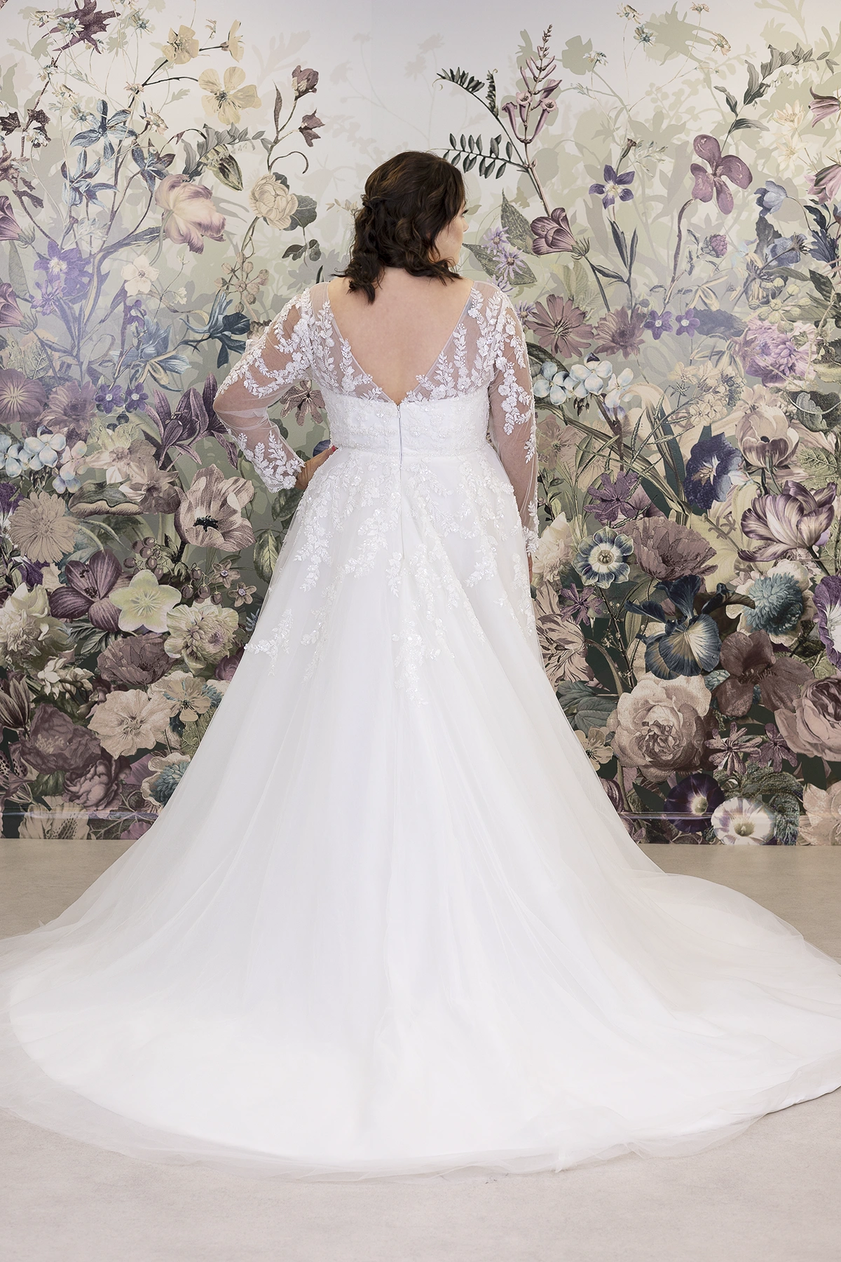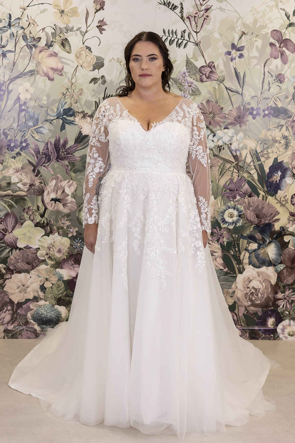 We love this gorgeous sleeves option! She features stunning illusion sleeves with perfectly placed appliqué details. Shimmering beautifully the appliqué details catch the light whilst the clever corsetry and sweetheart neckline work with curves for a figure flattering silhouette